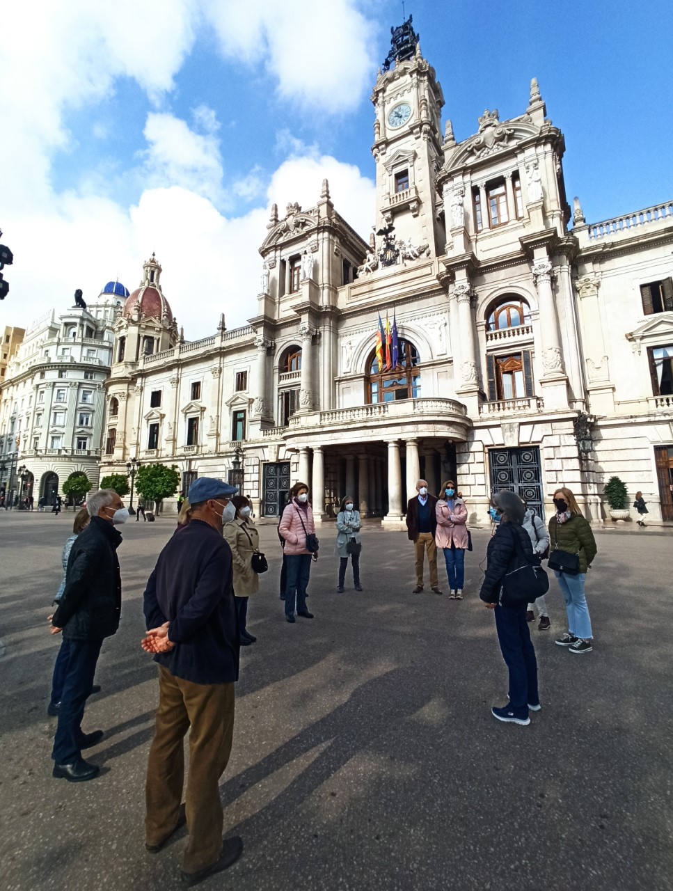 Nuestros asociados recorrieron la Plaza del Ayuntamiento y su entorno para conocer arquitecturas y arquitectos de la década de 1930, la nueva estética de la ciudad moderna. (imagenes:Javier Luna, Guía Esther Vayá)
