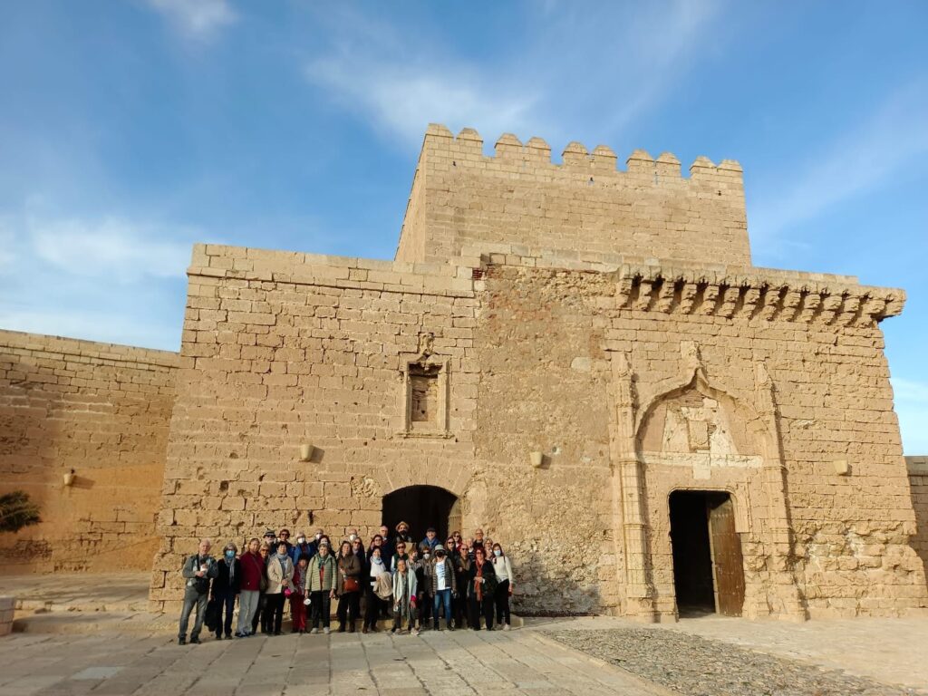 Por la tarde, y después del correspondiente buffet libre en el hotel nos encontramos con nuestra primera y simpática guía de la ciudad Cristina Gaitán, preparándonos para visitar la catedral situada en la parte antigua de Almería, paseando por callejuelas y recovecos de pasado árabe y observando que la zona se encuentra salpicada de tiendas y comercios, así como de agencias de viajes que ofrecen sus servicios a Nador, Melilla y Argel, la distancia con África es de solo 143 km. Una vez en la catedral contemplamos su gran claustro neoclásico el perfil de catedral-fortaleza y su interior dedicado a la virgen de la Encarnación. A continuación, y con el fin de que observar la amplitud de la ciudad desde una azotea muy bien ubicada, visitamos el Centro de Interpretación Arqueológica Puerta de Almería que es un espacio museológico dependiente de la Junta de Andalucía donde se muestran los únicos restos romanos conservados en la ciudad así como una de las puertas de la muralla islámica que la cerraba por el sur. Efectivamente, desde allí arriba, se ve una panorámica de todo un casco urbano que recuerda las ciudades norte africanas, casas como cubos y callejas serpenteantes con terrazas preparadas para soportar los rigores del verano.