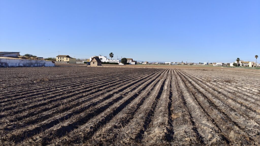 Íbamos observando que los campos de chufas ya estaban quemados, listos para la recolección de la chufa y los secaderos de chufa, repletos del dicho tubérculo secándose al sol. Preparación previa a la horchata que degustaremos el verano que viene.