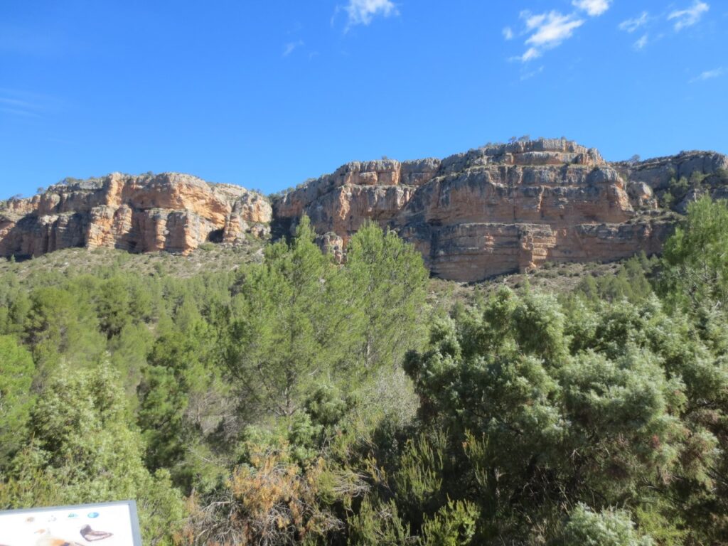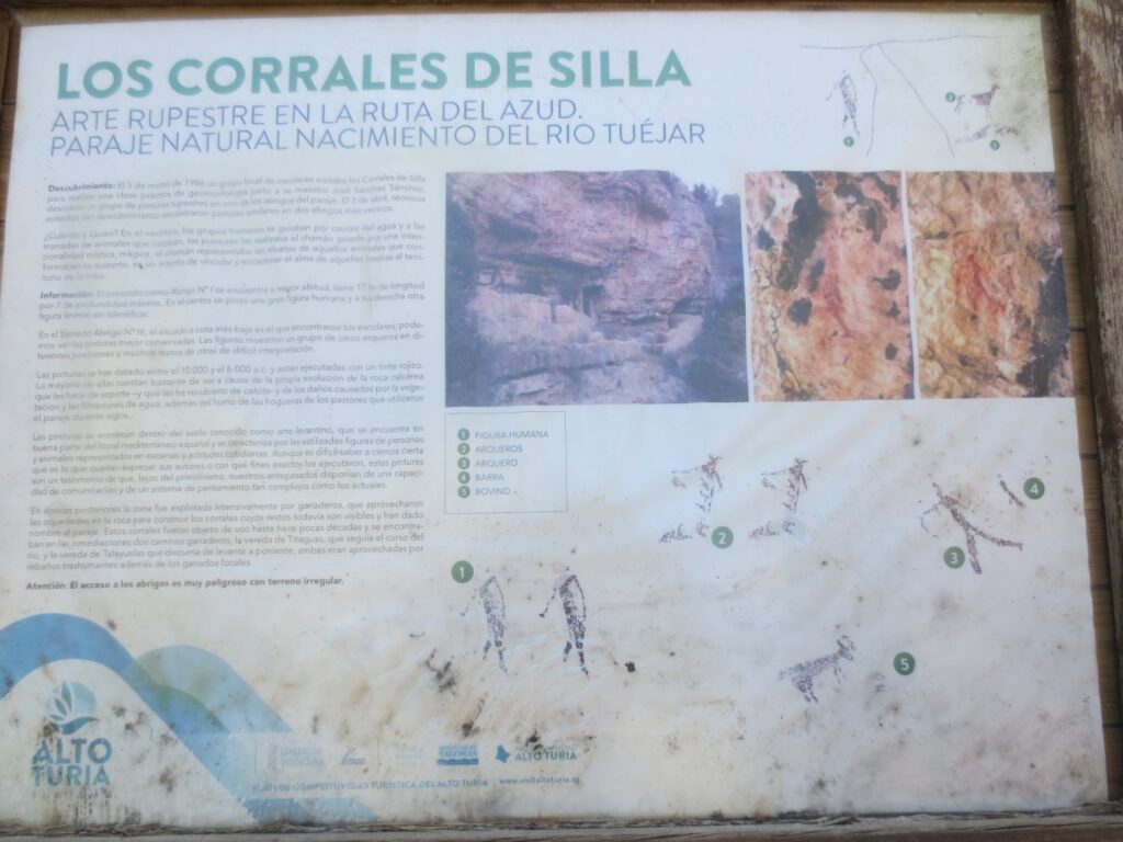 Pronto nos encontramos con los Corrales de Silla, unos abrigos que albergan pinturas rupestres en tonos negros, rojos y blancos. Aunque en bastante mal estado, muestran escenas de caza y recolección.